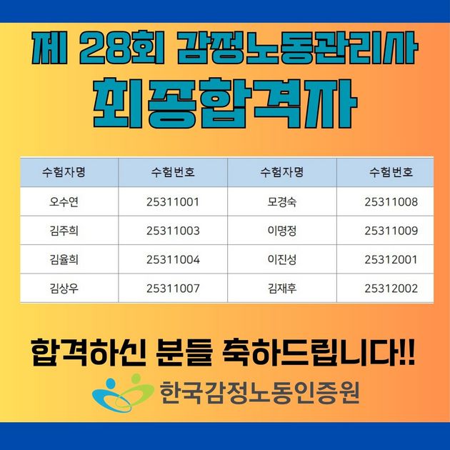 | 제목 | 제 28회 감정노동관리사 자격시험 최종 합격자 발표 | ||||