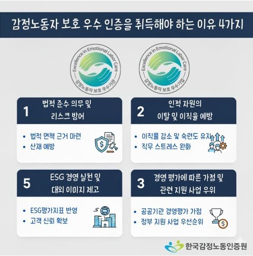 | 제목 | 감정노동자 보호 우수기관(기업) 인증을 취득해야 하는 4가지 이유 | ||||